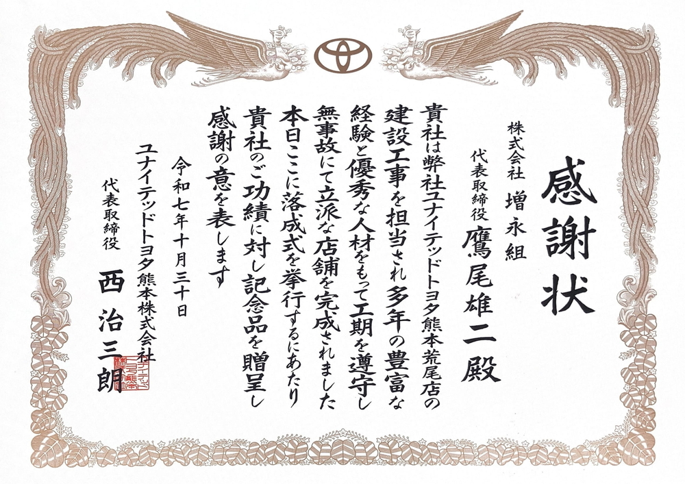 今回の工事において優れた業績を認められ、感謝状を授与されることとなりました。