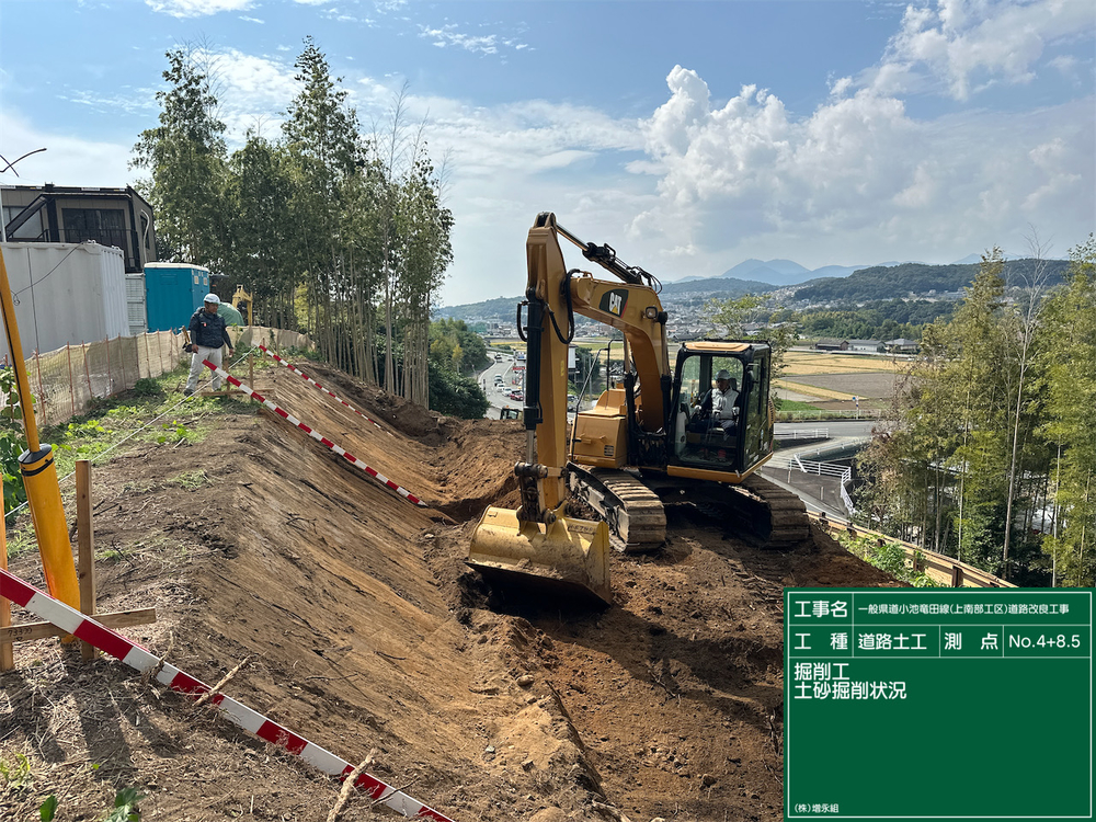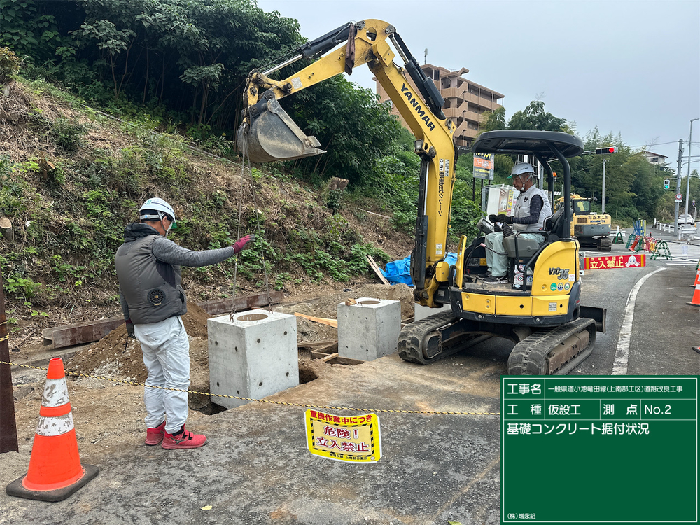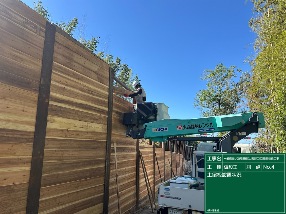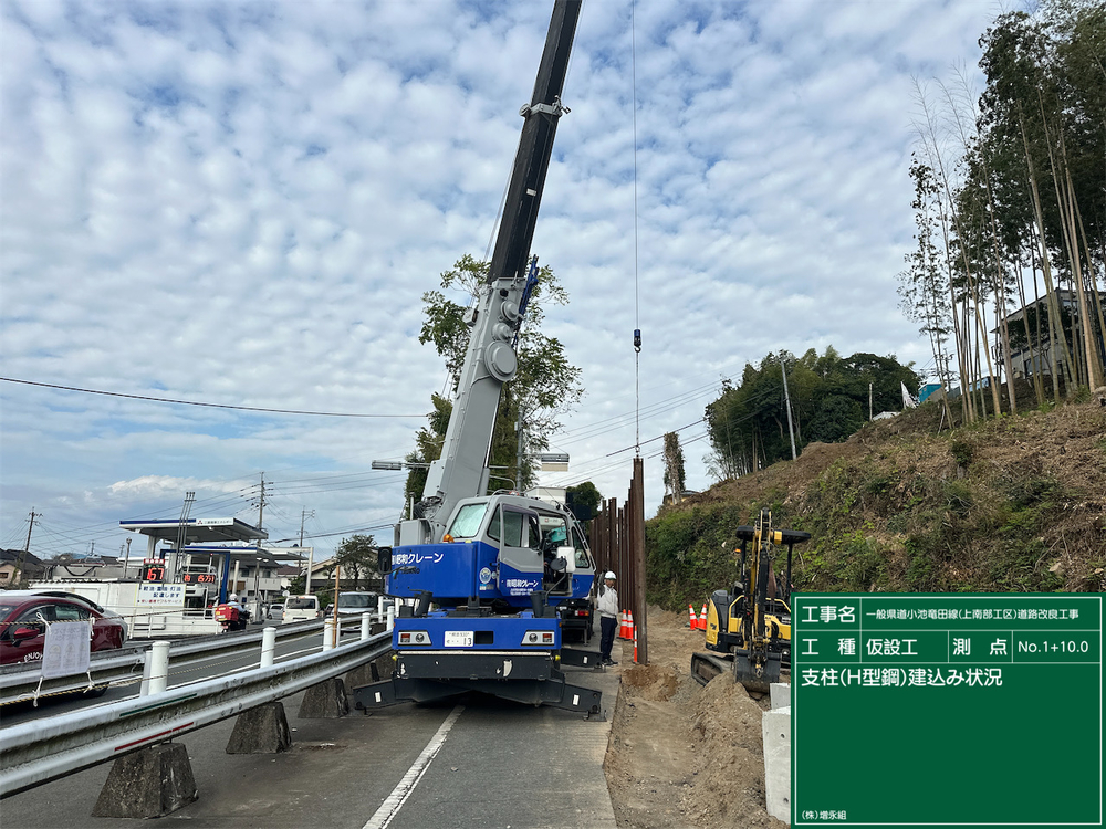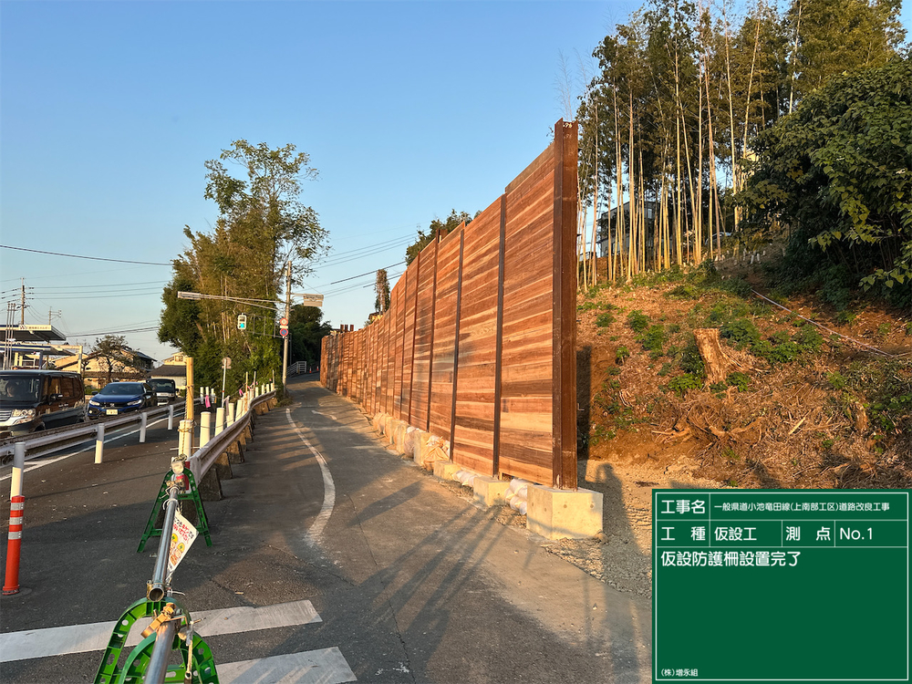 一般県道 小池竜田線(上南部工区)道路改良工事 №1 2025.10.20 2025年10月 ①落石防護柵の基礎設置 ②落石防護柵の支柱(H鋼)建込 ③土留板(杉板)設置 ④落石防護柵完成 ⑤土砂掘削 カリーノ宮崎 PC版補強その他工事 №2