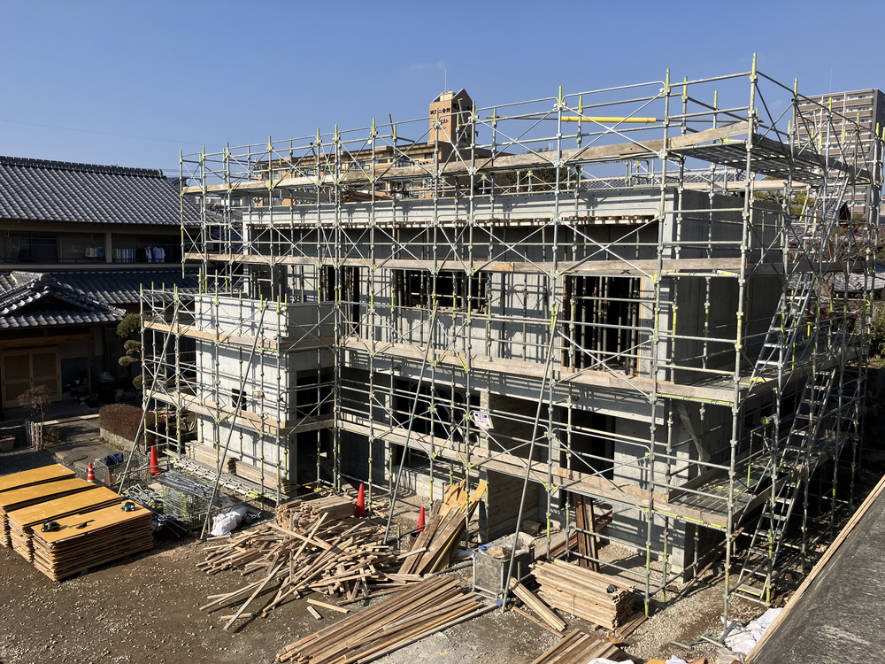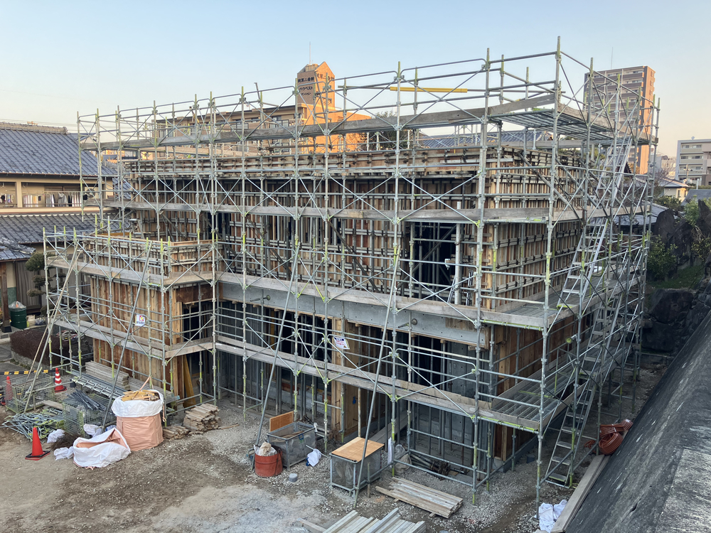 健軍の家新築工事 №2 2026.02.02 2026年2月 ・2階躯体型枠組み ・2階コンクリート打設 今月で2階コンクリート打設完了となり、 来月からサッシや防水工事、断熱工事の予定です。 引き続き安全第一で作業を進めてまいります。 玉名病院既存病院改修工事(管理棟・厨房) №2 第一高校長寿命化改修(第四期)工事 №2