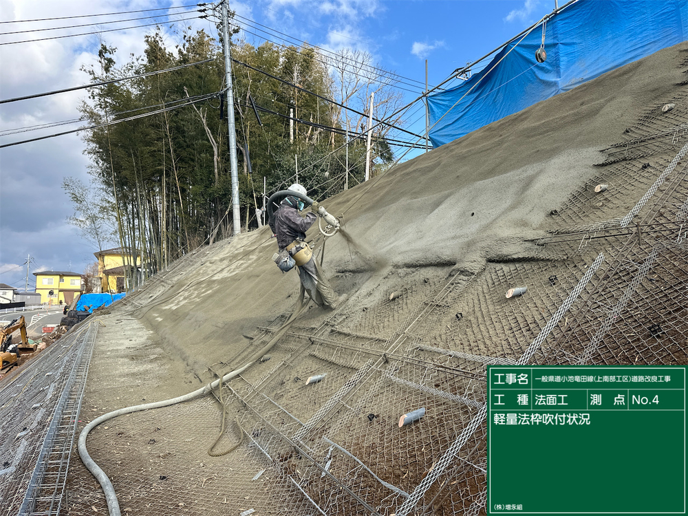 軽量吹付法枠の吹付作業を並行しておこなっています。