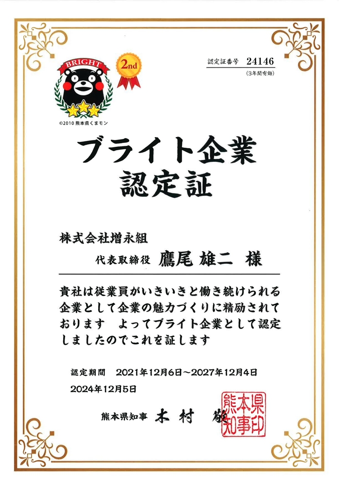 ㈱増永組は、これからも働きやすい職場の環境づくりに取り組んでまいります。
