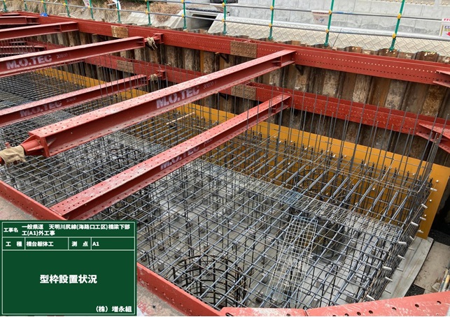 台躯体におけるフーチング部の鉄筋組立と型枠を設置しています。